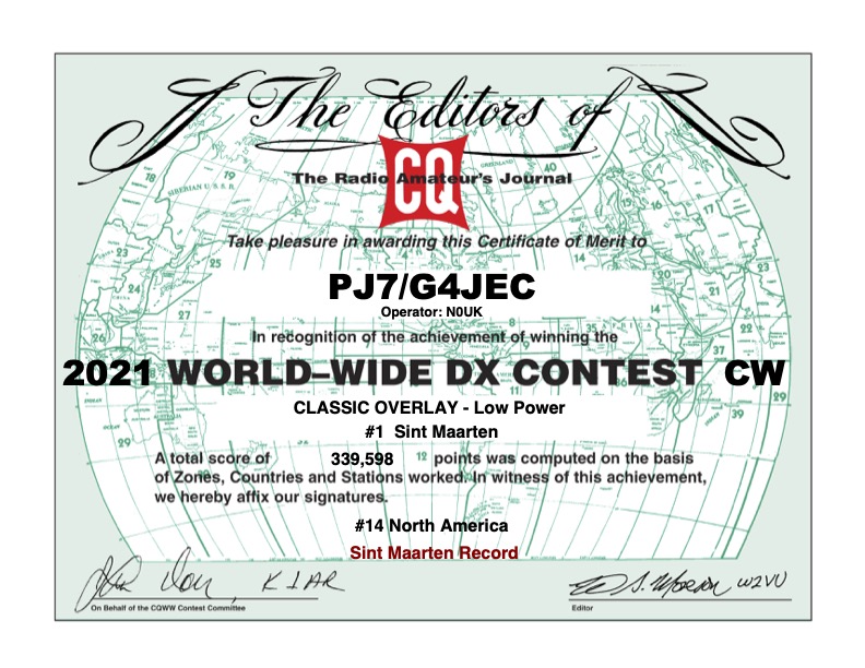 Our vacation partially coincides with one of the major annual amateur radio operating events, the CQ Worldwide DX CW contest which I took part in. I recently learnt that my entry set a new contest record from the island when running low power - see the certificate below!